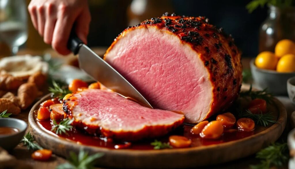 A fully cooked bone-in ham is among the most hospitable things you can put on a table. Score the fat in a diamond pattern, stud each intersection with a clove, and paint the whole surface with a glaze of honey, Dijon mustard, orange zest, and a splash of apple cider vinegar. It goes into a 175°C (350°F) oven for roughly ninety minutes, basting every twenty minutes. The glaze caramelizes into something lacquered and fragrant. It serves beautifully at room temperature, which removes all timing pressure entirely.