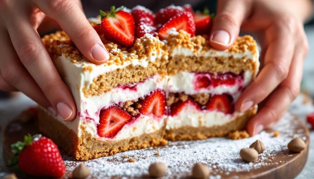 Layer after layer of whipped cream and thin wafer cookies, pressed into a loaf pan and left in the fridge overnight. The cookies absorb the cream slowly, softening into something that slices like a cake but tastes like a cloud. Use the first strawberries of the season — small, fragrant, slightly tart — sliced thin and pressed between each layer. The fruit releases a faint juice that stains the cream pink at the edges. Chill for at least 8 hours, preferably 12. The longer it sits, the more the layers become one.